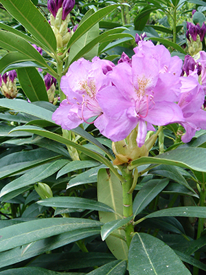 - Pěnišník (Rhododendron sp.) – atraktivní keř s výraznými květy.